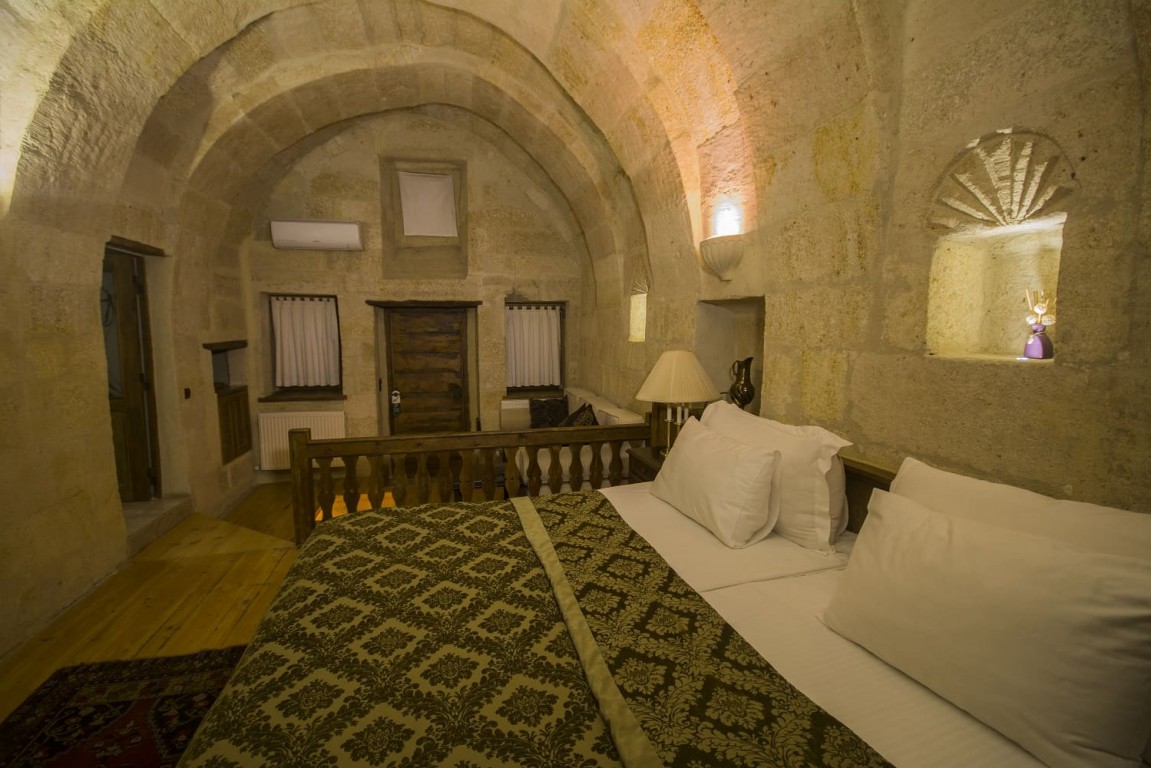 On the second floor. The room has Erciyes Mountain and Eastern part onto Ürgüp view. When you enter the room you will see an old owen on the floor. The bedroom has stone arch and old closets. The bathroom is an original cave. The old banister is brought from an old house and the headboard was made from the door which has daisy figure.